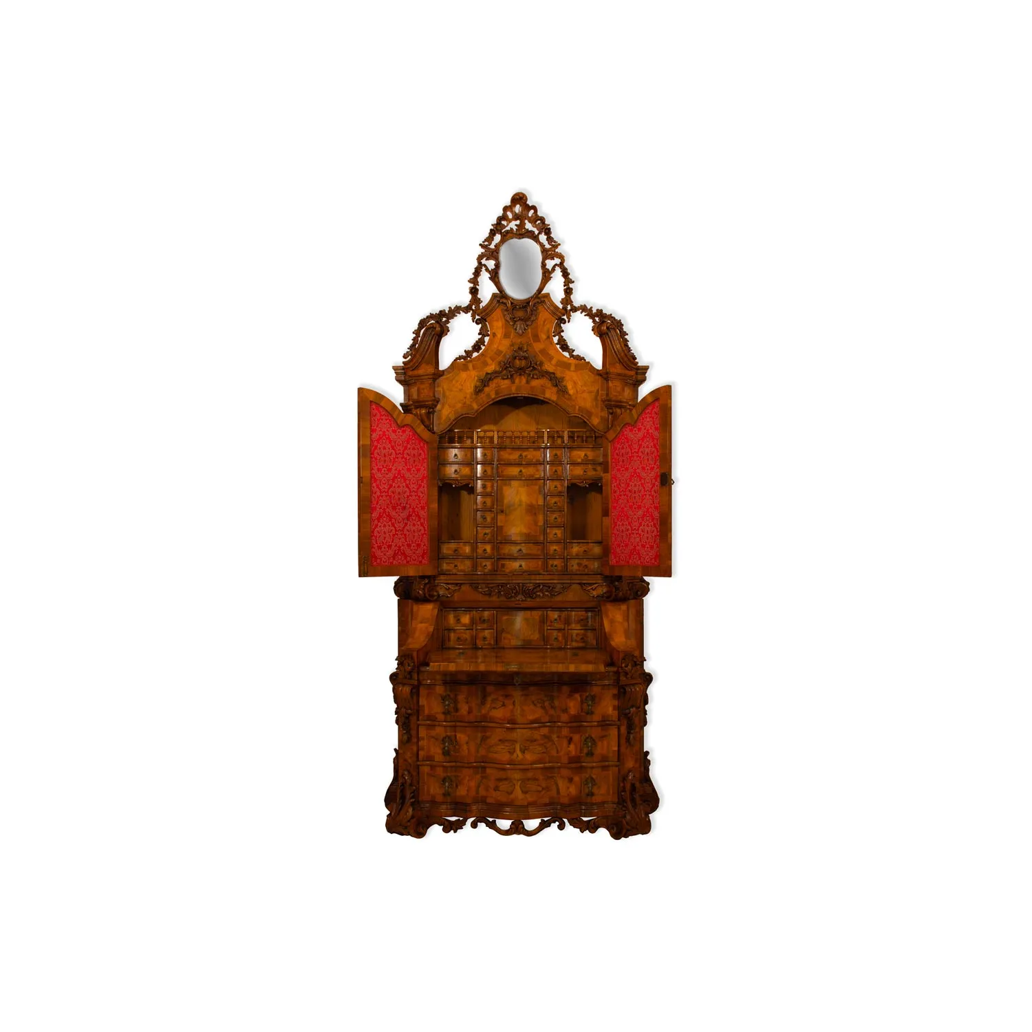 The interior of the top holds an elaborate castle made of 28 small drawers alternated with 3 niches and 1 door.