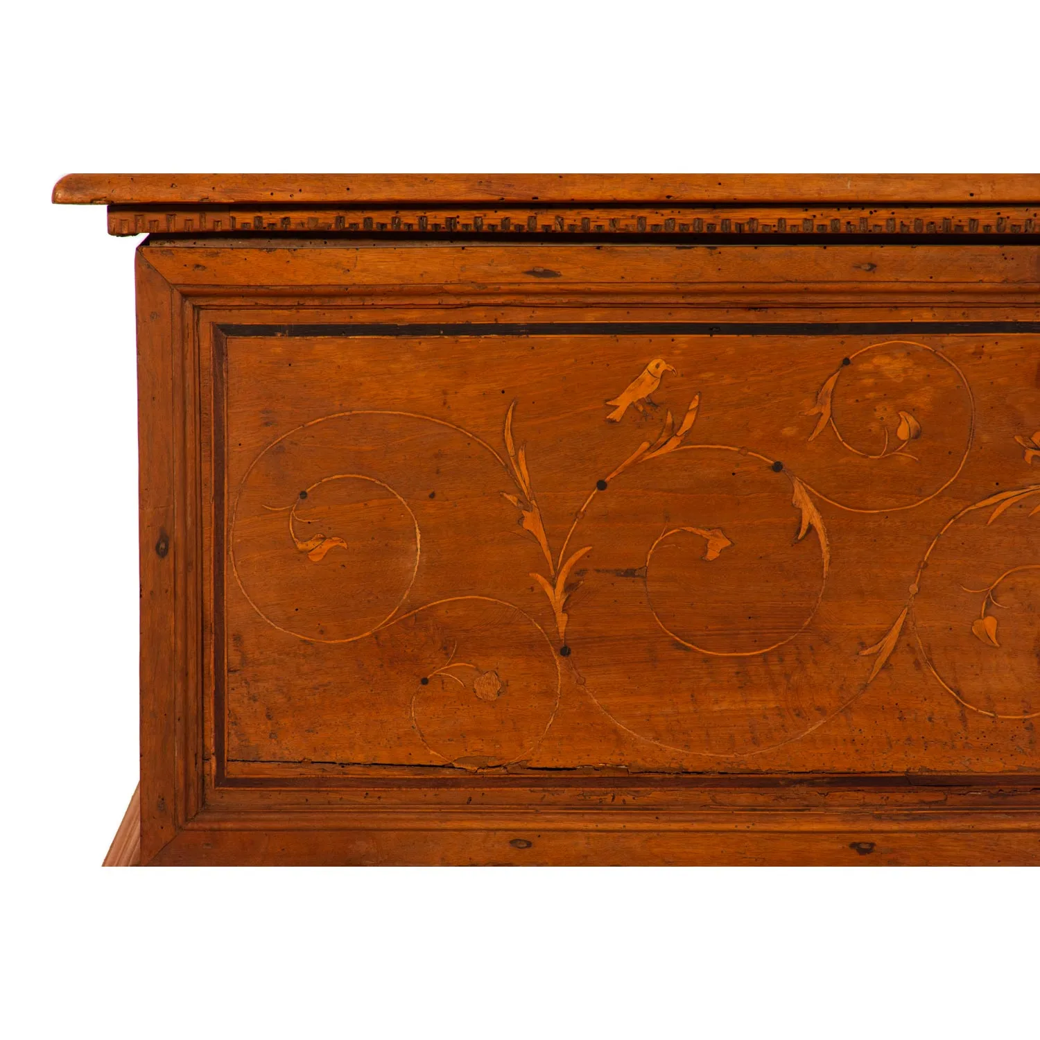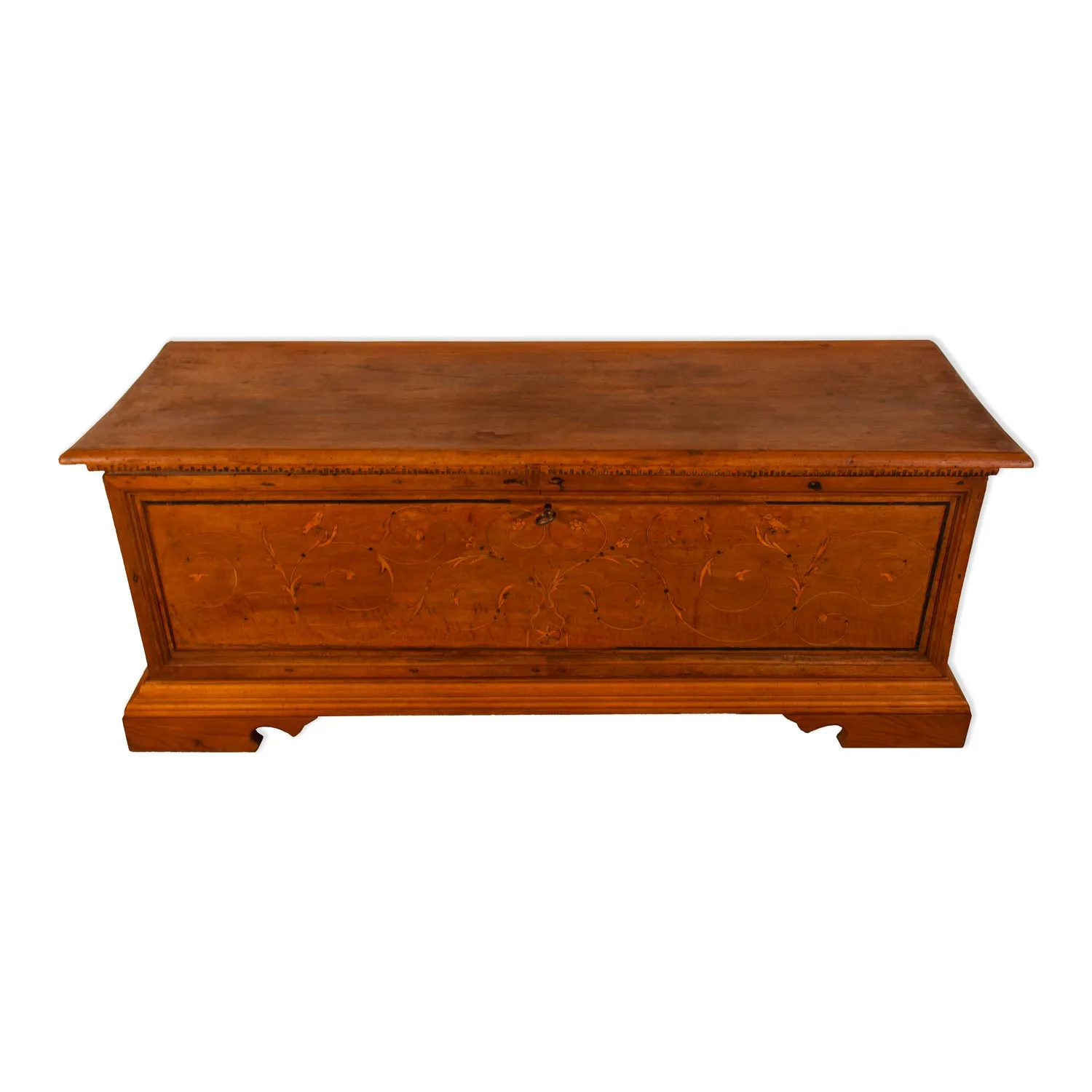 La cassapanca in questione è stata restaurata in modo accurato poiché era necessario riportare al massimo splendore l’intarsio certosino presente sul fronte.